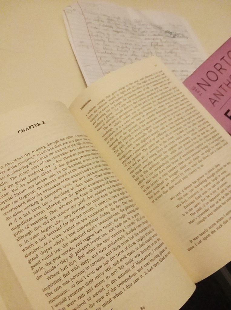 At this time in the novel, Victor Frankenstein overlooks a valley of ice and solitude, contemplating the hubris of man. However, quite recently– at the most, a few months ago– Frankenstein’s young brother had been viciously murdered. Frankenstein’s dear childhood friend had been, as Frankenstein believes, wrongfully hanged for the crime. Blaming himself, he believes that the monster he created had murdered his brother. He had fallen into a deep depression that he could explain to no one surrounding him. Despite these tragedies, Frankenstein feels utter calm looking down on this scene. A walk through mountains and glaciers seems to have entirely cleared his mind of the preceding months of hardship. It would seem as though Frankenstein’s “yesterday may ne’er be like his morrow” (Bysshe Shelly 766). Though he enjoys thinking of himself as above other humans, Frankenstein is just as fickle as his imperfect peers.